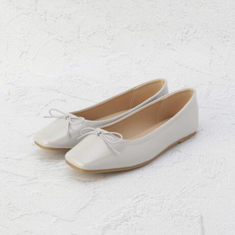 スクエアトゥのつま先と光沢のあるエナメル素材が、大人可愛いフラットシューズです。