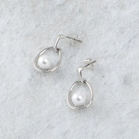 洗練されたメタルオーバルの形状に、上品なフェイクパールをあしらったピアス。