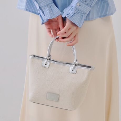 本体はエルガリー調のキャンバス素材を使用し、持ち手や開き口、ショルダー部分などにはスムースな質感の合皮素材を使用しています。