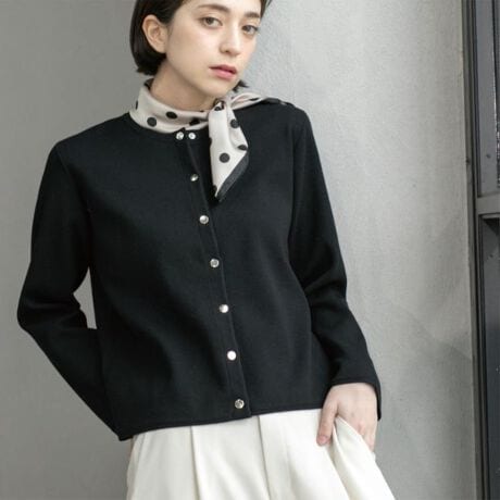スナップボタンとショート丈のバランスがトレンド感のあるニットカーディガン