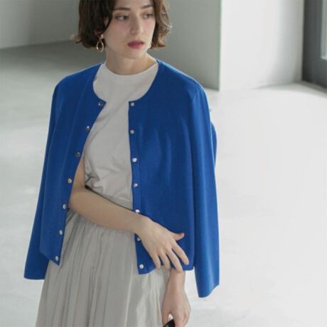 スナップボタンとショート丈のバランスがトレンド感のあるニットカーディガン