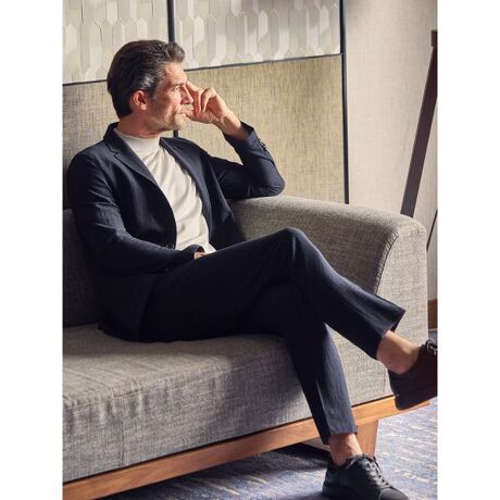 強撚の極細のウール糸を使用し、絶妙なシャリ感とドライタッチを実現させた素材を採用しました。チョークストライプと自然に入ったシボ感が融合し、着用しやすい表情なのも特徴です。