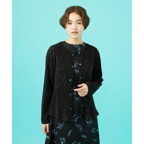 細かいプリーツ素材が特徴のブラウス。着回し力抜群なベーシックなシルエットです。きれいめにも合わせていただきやすいセットインスリーブ仕様。フロントボタンで着脱できるので、羽織りとしても活躍してくれるひと品です。2つ並んだ配色ボタンが全体のアクセントに。ボタンは1つが飾りボタンです。ノーカラーデザインは首元のおしゃれも楽しめます。