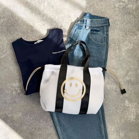 可愛らしいニコちゃんマークがポイントのメッシュトート