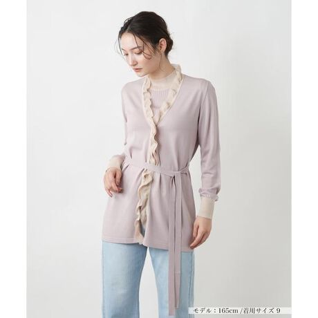 フリルディテールが華やかなロングカーディガン。ウエストリボンでシルエットの変化を楽しめるデザイン。軽やかな素材感で季節の変わり目にも活躍。フェミニンなスタイルを演出する一枚。