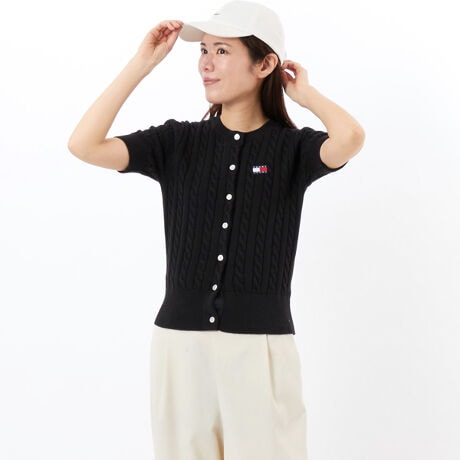 あたたかな季節にも着用できるショートスリーブのケーブルカーディガン。コットン100%のサマーニットを使用しており、ナチュラル素材特有の柔らかな肌触りが実感できます。左胸にはバッジロゴのアクセントをプラス。フロントボタンを閉めればプルオーバーとして着こなせます。