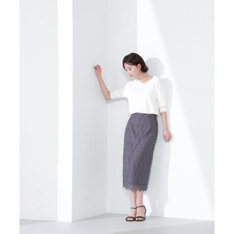 お仕事シーンにもぴったりな品の良いレースタイトスカート。すっきりとしたIライン&ハイウエストで腰まわりをカバーしながら、キレイなレッグラインも叶えてくれます。裾はレースの雰囲気を活かした、透け感のあるスカラップディテールで、軽やかな足元を演出。キレイ目なブラウスを合わせたスタイリングがおすすめです。<素材>程よい厚みの上品な印象のレース素材を使用しています。<詳細>仕様・後ろファスナー裏地・あり透け感・なし / 光沢・なし / 伸縮性・なし 生地の厚さ・普通※モデルの着用画像の場合、光の当たり具合により、実際の色味と異なって見えることがございます。色味は、商品単体の画像をご参照ください。