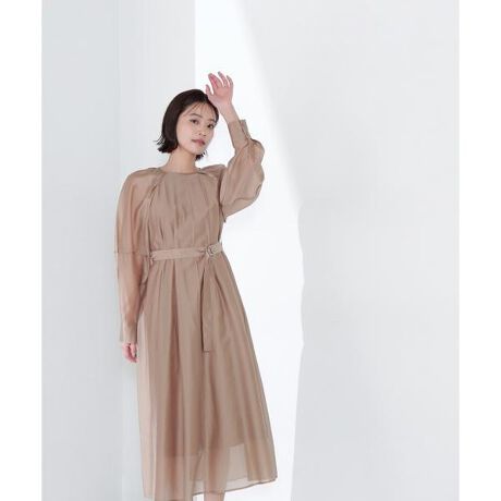 襟が開きすぎないクルーネックデザインで、ONにもOFFスタイルにも上品な印象で着られるワンピース。袖は裏地がなく、透け感を楽しめるボリュームスリーブデザインです。ウエストはタックを入れてくびれを強調しつつ、さらに共地ベルトでしっかりウエストマークが出来ます。<素材>今期トレンドのシアー素材を使用。しなやかなハリ感と整った表面でキレイめな印象です。<詳細>仕様・後ろファスナー裏地・あり透け感・あり / 光沢・なし / 伸縮性・なし 生地の厚さ・薄手※モデルの着用画像の場合、光の当たり具合により、実際の色味と異なって見えることがございます。色味は、商品単体の画像をご参照ください。