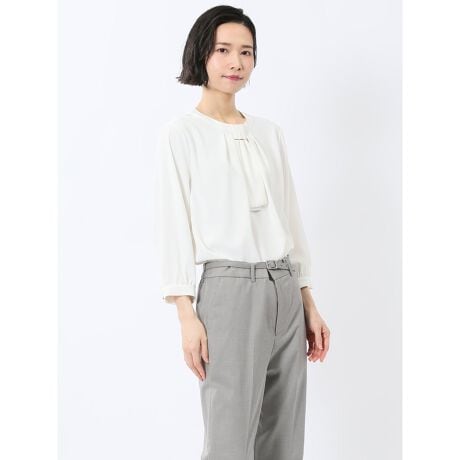 【イージーケア】m.f.エディトリアル 金具付きボウタイ風 7分袖プルオーバーブラウス