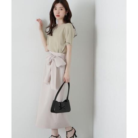 大きめリボンがポイントのナロースカート。リボンは一枚仕立てで軽くデザインし、シンプルトップスと合わせるとアクセントになります。甘くなりすぎない大人カラーも魅力。<素材>ポリエステル素材を使用しています。<詳細>仕様・後ろファスナー裏地・あり透け感・なし / 光沢・なし / 伸縮性・なし 生地の厚さ・普通※モデルの着用画像の場合、光の当たり具合により、実際の色味と異なって見えることがございます。色味は、商品単体の画像をご参照ください。