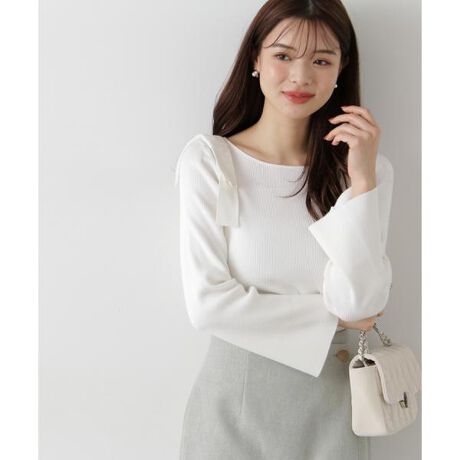 主張しすぎない肩リボンがポイントのリブニット。リボンは身頃と同じニット素材を使い、肩に沿って付けているため、ジャケットインでもごわつかずに着用いただけます。袖口はフレアにし、腕をすっきりと見せてくれるシルエットもポイント。甘くなりすぎないリボンディテールなので、オンオフ問わず着回せます。フェミニンな雰囲気のエクリュとピンク、キレイで珍しい色味が印象的なグレーの3色展開です。<素材>着やすいリブニット素材を使用しています。<詳細>仕様・開閉なし裏地・なし透け感・なし / 光沢・なし / 伸縮性・あり 生地の厚さ・普通※モデルの着用画像の場合、光の当たり具合により、実際の色味と異なって見えることがございます。色味は、商品単体の画像をご参照ください。