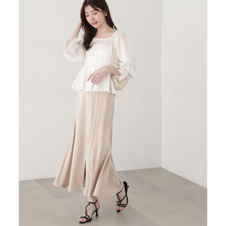 配色パイピングがポイントのマーメイドスカート。パイピングで縦のシルエットを引き立てながら、体のラインもキレイに見せてくれるデザインです。フロントにスリットを入れているので歩きやすさも◎。品の良さを感じさせるカラーが、春らしいコーディネートを叶えてくれます。<素材>さらっとしたポリエステル素材を使用しています。<詳細>仕様・後ろファスナー裏地・あり透け感・なし / 光沢・なし / 伸縮性・なし 生地の厚さ・普通※モデルの着用画像の場合、光の当たり具合により、実際の色味と異なって見えることがございます。色味は、商品単体の画像をご参照ください。