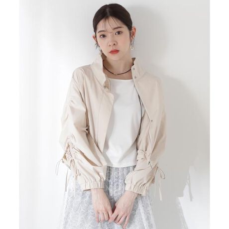 袖のシャーリングリボンがポイントのブルゾン。裾は後ろの丈を少し長く取ることで脚長効果を狙いながら、後ろ姿が気になりにくいシルエットです。裾はドローストリング付きなので、コーディネートに合わせてシルエットの調節ができます。<素材>さらっとしたタフタ生地を使用しています。<詳細>仕様・前ファスナー裏地・なし透け感・なし / 光沢・なし / 伸縮性・なし 生地の厚さ・普通※モデルの着用画像の場合、光の当たり具合により、実際の色味と異なって見えることがございます。色味は、商品単体の画像をご参照ください。