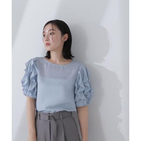 ふんだんに入れたボリュームフリルが一枚で着映えるブラウス。程よい透け感のある素材なので夏本番もお使いいただけます。袖のボリュームフリル部分のみ、落ち感のあるシアー素材で引き算したデザイン。襟はすっきりとしたボートネックなので華奢なネックレスをつけると、華やかにも着こなせます。パンツやスカートなど、どんなボトムとも相性良く着ていただけます。<素材>程よい落ち感のあるシアーな綾素材を使用しています。<詳細>仕様・後ろボタン裏地・なし透け感・あり / 光沢・なし / 伸縮性・なし 生地の厚さ・薄手※モデルの着用画像の場合、光の当たり具合により、実際の色味と異なって見えることがございます。色味は、商品単体の画像をご参照ください。