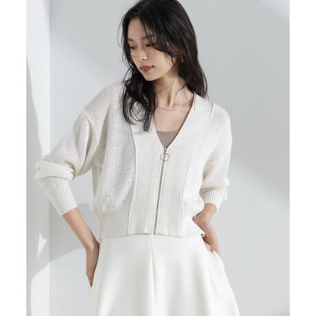 リネン混のナチュラルなテープヤーンを使用したZIPカーディガン。カジュアル感の強い素材に相反するメタルZIPPER使いでトレンド感をプラス。プルオーバーとしても軽羽織りとしても着回せる万能アイテムなので、クローゼットに備えておくと重宝しそう。