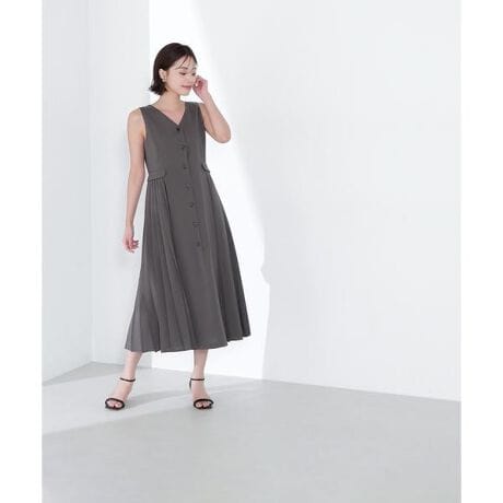 サイドプリーツを切り替えたデザインが印象的なジャンスカ。プリーツ切り替え部分には、斜めに飾りフラップポケットをアクセントに効かせたデザイン。ふわっと揺れるシルエットに、フロントの小さめスコッチ釦がポイントです。すっきりとしたVネックなのでコンパクトなインナーを合わせてレイヤードしたり、一枚着としてもコーディネートを楽しめます。<素材>さらっとドライタッチな合繊リネンライク素材を使用。<詳細>仕様・前ボタン裏地・あり透け感・なし / 光沢・なし / 伸縮性・ややあり 生地の厚さ・普通※モデルの着用画像の場合、光の当たり具合により、実際の色味と異なって見えることがございます。色味は、商品単体の画像をご参照ください。