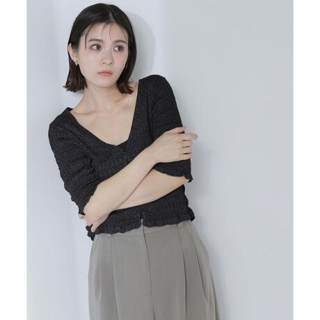 シンプルながらも編地が特徴的でアクセントになるカーディガン。ボタンを留めるとトップスとしてもお使いいただけます。ころんとしたボタン使いで主張しすぎないデザインに。クロップド丈なのでパンツと合わせて甘さを引き算するのもおすすめです。さり気ないキラッとした糸を使用しているので、カジュアルダウンをしても品のある雰囲気で着こなせます。<素材>きらめき感のある柄編みです。<詳細>仕様・前ボタン裏地・なし透け感・なし / 光沢・なし / 伸縮性・あり 生地の厚さ・普通※モデルの着用画像の場合、光の当たり具合により、実際の色味と異なって見えることがございます。色味は、商品単体の画像をご参照ください。