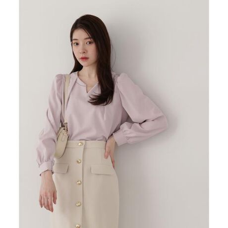 襟にチェーンを付けたキレイめブラウス。チェーンは取り外しができます。襟から広めのタックを入れており、胸元がすっきり見えるデザイン。袖口の内側がシャーリングゴムなので動きやすく、デザインポイントにもなりつつ、手首をきゅっと引き締めながら着用いただけます。<素材>さらっとしたポリエステル素材を使用。シワになりにくい素材です。<詳細>仕様・後ろボタン裏地・あり透け感・なし / 光沢・なし / 伸縮性・なし 生地の厚さ・普通※モデルの着用画像の場合、光の当たり具合により、実際の色味と異なって見えることがございます。色味は、商品単体の画像をご参照ください。
