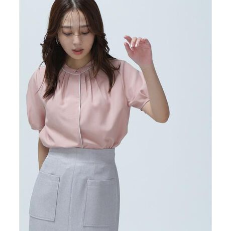 台衿に効かせたゴールドカラー釦がキラっとポイントのきれいめブラウス。配色に拘った華奢に効かせたラインが、全体を明るい印象に見せてくれます。襟ぐりはタックデザインで首まわりを華やかで立体的に演出。タックで仕上げたパフスリーブは甘すぎず上品な印象で着ていただけます。<素材>麻調の様なメランジ感のある合繊素材を使用。さらりとしたタッチで軽やかな素材感です。<詳細>仕様・前ボタン裏地・なし透け感・なし / 光沢・なし / 伸縮性・なし 生地の厚さ・普通※モデルの着用画像の場合、光の当たり具合により、実際の色味と異なって見えることがございます。色味は、商品単体の画像をご参照ください。