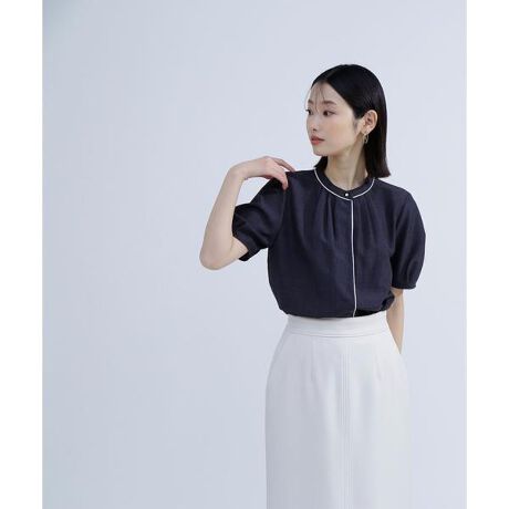 台衿に効かせたゴールドカラー釦がキラっとポイントのきれいめブラウス。配色に拘った華奢に効かせたラインが、全体を明るい印象に見せてくれます。襟ぐりはタックデザインで首まわりを華やかで立体的に演出。タックで仕上げたパフスリーブは甘すぎず上品な印象で着ていただけます。<素材>麻調の様なメランジ感のある合繊素材を使用。さらりとしたタッチで軽やかな素材感です。<詳細>仕様・前ボタン裏地・なし透け感・なし / 光沢・なし / 伸縮性・なし 生地の厚さ・普通※モデルの着用画像の場合、光の当たり具合により、実際の色味と異なって見えることがございます。色味は、商品単体の画像をご参照ください。