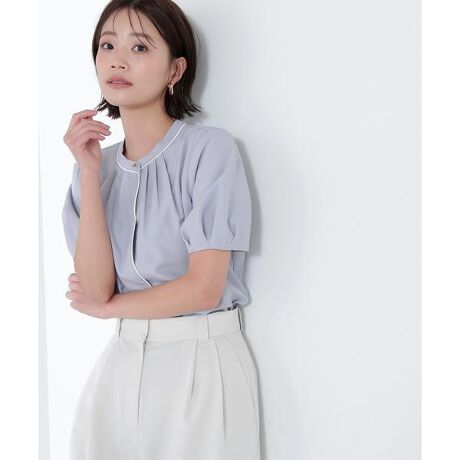 台衿に効かせたゴールドカラー釦がキラっとポイントのきれいめブラウス。配色に拘った華奢に効かせたラインが、全体を明るい印象に見せてくれます。襟ぐりはタックデザインで首まわりを華やかで立体的に演出。タックで仕上げたパフスリーブは甘すぎず上品な印象で着ていただけます。<素材>麻調の様なメランジ感のある合繊素材を使用。さらりとしたタッチで軽やかな素材感です。<詳細>仕様・前ボタン裏地・なし透け感・なし / 光沢・なし / 伸縮性・なし 生地の厚さ・普通※モデルの着用画像の場合、光の当たり具合により、実際の色味と異なって見えることがございます。色味は、商品単体の画像をご参照ください。