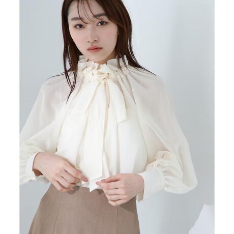 NBBで昨年人気だったシアーボウタイブラウスを今年らしくアップデート!ボウタイにシャープさを出して、顔まわりの印象をすっきりさせたデザインです。ネックラインはボウタイの絞り具合で調節が可能。ジャケットインでお仕事シーンはもちろん、カジュアルボトムを合わせれば、普段使いもしやすいです。程よいシアー感のある素材なので品の良さを感じさせる一枚。カラー展開もアップデートしており、今年らしく着ていただけます。<素材>程よい透け感のあるしなやかなシアー素材を使用しています。<詳細>仕様・開閉なし裏地・なし透け感・あり / 光沢・なし / 伸縮性・なし 生地の厚さ・薄手※モデルの着用画像の場合、光の当たり具合により、実際の色味と異なって見えることがございます。色味は、商品単体の画像をご参照ください。