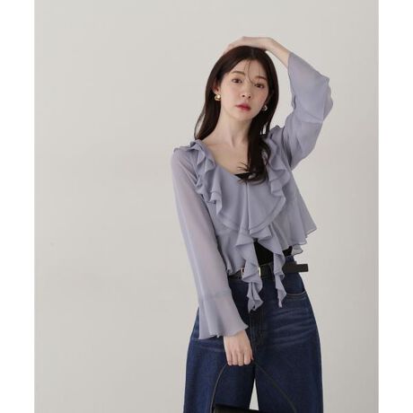 ラッフルをふんだんに入れたブラウスは、今年らしいボヘミアンなコーディネートに見せてくれます。フロントはホック開閉で華奢見えに。透ける素材なので、お持ちのインナーを合わせると安心です。ジョーゼット素材は暑い時期にも取り入れやすくておすすめです。<素材>ジョーゼット素材を使用しています。<詳細>仕様・前ホック裏地・なし透け感・あり / 光沢・なし / 伸縮性・なし 生地の厚さ・薄手※モデルの着用画像の場合、光の当たり具合により、実際の色味と異なって見えることがございます。色味は、商品単体の画像をご参照ください。