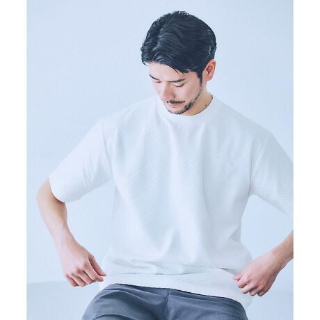 生地に凹凸を出してジオメトリック柄を表現したクルーネックTシャツ。 一枚で着ても様になり、ジャケットのインナーとしても着回しやすい すっきりとしたシルエットに仕上げました。