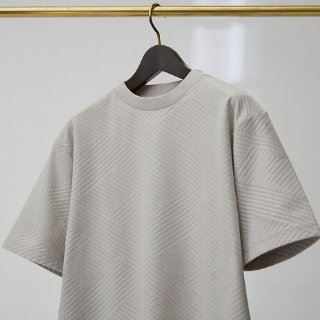 生地に凹凸を出してジオメトリック柄を表現したクルーネックTシャツ。 一枚で着ても様になり、ジャケットのインナーとしても着回しやすい すっきりとしたシルエットに仕上げました。