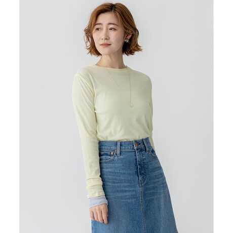 シアーな素材感のカットソー。コンパクトながら肌に張り付かないサイジングで、異なるカラーを2枚レイヤードして、色の重なりを楽しめるアイテムです。ホワイト×ライトイエローや、サックスブルー×ベージュなど、色の組み合わせ次第で印象も変わり、新鮮なスタイリングを叶えます。また、シャツやニットの襟ぐりや袖口からちらりとのぞかせても、今年らしい抜け感をプラスします。カラーは、清潔感のあるホワイト(#001)、シックなブラック(#005)、上品なベージュ(#033)、爽やかなサックスブルー(#073)、ヘルシーな印象のライトイエロー(#042)の5色展開です。