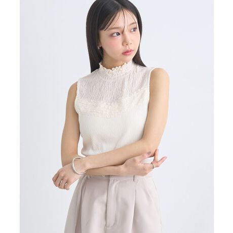 レースとリブがドッキングしたフェミニンなタンクトップ。シャーリングを施したハイネックがスタイリングを上品に演出します。レースの透け感がレディムードを盛り上げてくれるアクセントに。シンプルなデザインで着回しもしやすく、インナー使いにもピッタリなおすすめのアイテムです。