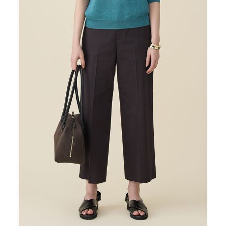 UVカット、接触冷感のクロップド丈ワイドストレートパンツ■デザインワイドストレートシルエットのクロップド丈パンツです。程よいストレートシルエットとクロップド丈で足元に抜け感が出るデザインです。ストレッチ性のある素材なので締め付け感が少なく、ウエストの後ろ部分がゴム仕様になっているので、ストレスフリーな着心地です。普段使いはもちろん、ジャケットやブラウスを合わせてお仕事着としても着回しできます。■素材サテン組織のヨコストレッチ性素材です。綿のカジュアル感と微光沢でオンオフ着用でき、ヨコ糸にポリエステル糸を打つことにより、さらっとした肌触りです。UVカット素材なので紫外線を透しにくく、接触冷感機能もあるので春夏にぴったりな素材です。■同素材アイテムテーパードパンツ(PRWMGM0316)