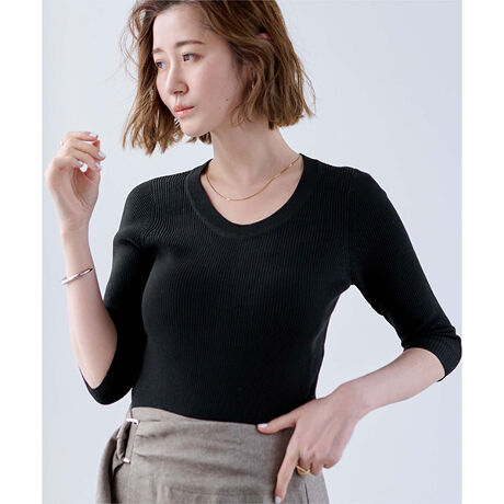 ベーシックに使えるUネックリブニットUネックが抜け感をプラスシーズンレスで活躍する七分袖フィットするシルエットでジャケットの下に合わせて頂くのもおすすめです。[型番:BFXU1840]
