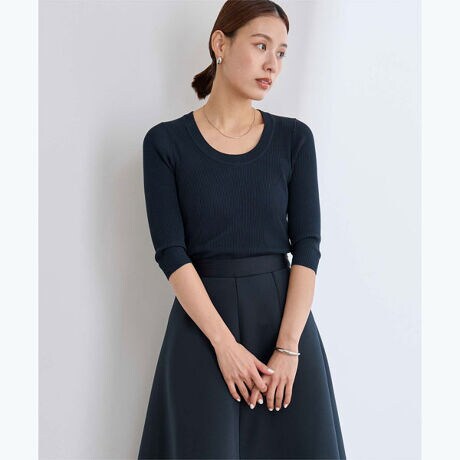 ベーシックに使えるUネックリブニットUネックが抜け感をプラスシーズンレスで活躍する七分袖フィットするシルエットでジャケットの下に合わせて頂くのもおすすめです。[型番:BFXU1840]