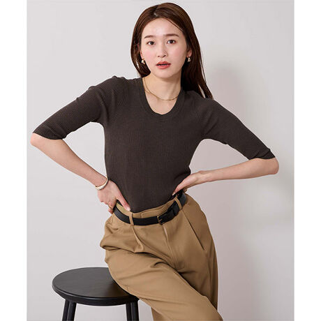 ベーシックに使えるUネックリブニットUネックが抜け感をプラスシーズンレスで活躍する七分袖フィットするシルエットでジャケットの下に合わせて頂くのもおすすめです。[型番:BFXU1840]