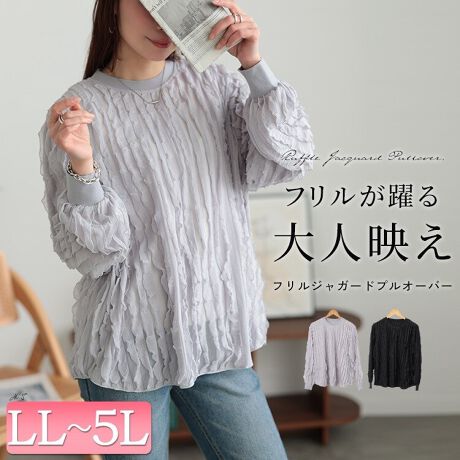 【大きいサイズ】 フリルタックジャガードプルオーバー 大きいサイズ レディース トップス カットソー