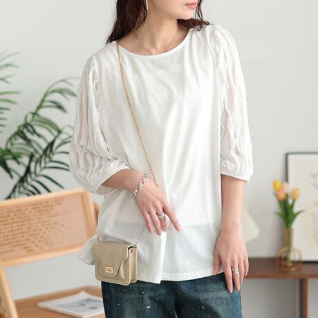 女性らしい華やかさを加えるフリルスリーブチュニック。着こなしやすいカットソーを、レディにアップデートさせてくれる一枚。スリーブのたっぷりフリルがひらひらと躍り、シアー素材のドッキングで軽快さを演出します。ぽわんとしたパフスリーブがガーリッシュなひと匙に。程よく広がるチュニック丈でラフな印象に。モタつきなく、ゆったりとした着心地に長過ぎないチュニック丈で、すっきり体型カバー。窮屈感のないラウンドネックが、お顔周りもすっきり見え。華やかさを演出しながら、シンプルなデザインだからコーデに取り入れやすいのもポイントに。