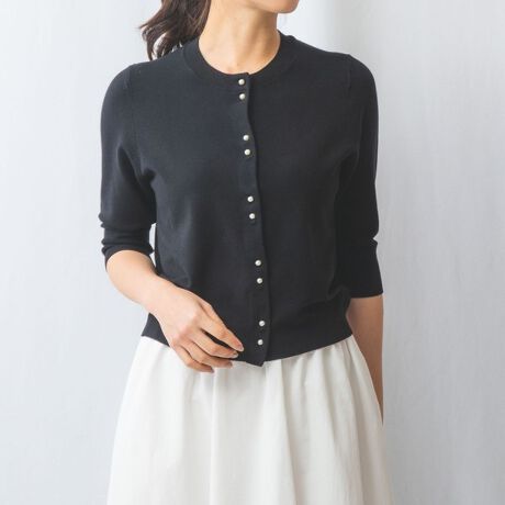 小さいパールボタンが控えめなアクセントになっているコンパクトカーディガン。リズミカルな配置と柔らかな光を纏うパールボタンで、エレガントな大人の女性らしさを演出します。クロップド丈のスリーブで程よく抜け感があり、スタイリングのこなれ度もさりげなくアップ。普段使いにはもちろんオフィスカジュアルや休日のお出かけなどの様々なシーンにも活躍してくれる1枚です。