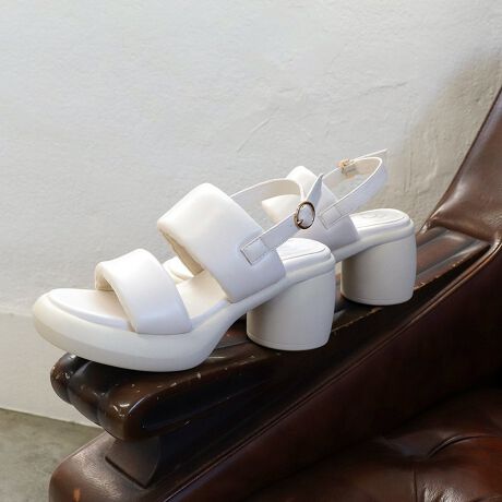 ぷっくりと丸みのあるフォルムが目を惹くパデットサンダル。クッションのようなアッパーは見た目のインパクトだけでなく、足あたりがソフトでやさしく甲をホールドします。円柱のヒールはしっかり太さがあり安定感◎ 前底にも厚みがあるので傾斜が緩やかで歩きやすいのもポイントです。