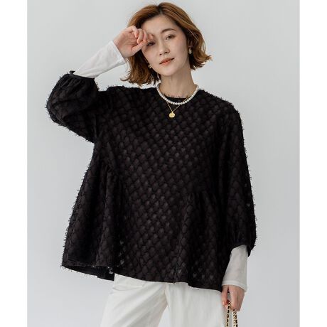 トレンド感のあるシアーなアーガイル柄のジャカードで仕立てたブラウスです。身頃の両脇ウエスト下あたりから切り替えを入れてボリュームを出しています。ゆとりを持たせたシルエットですが、落ち感のある素材なので広がらず細見えするのも嬉しいポイント。細身のテーパードパンツなどと合わせたきれいめスタイルはもちろん、ワイドデニムなどのカジュアルアイテムとも相性が良いので、様々なシーンで活躍する1枚です。カラーは、優しい雰囲気のアイボリー(#002)、モードな印象のブラック(#005)2色展開です。