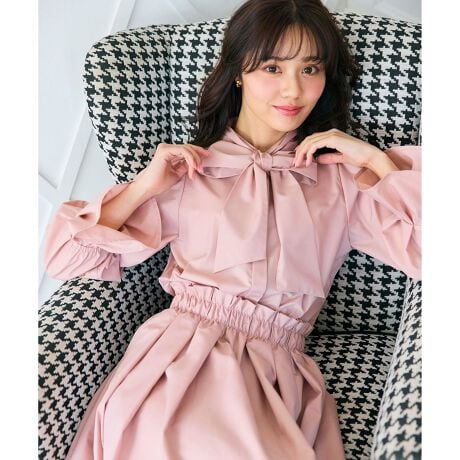 張りのある素材感でリボンが綺麗に仕上がるブラウス。同素材のスカートと着合わせて、キレイ見えセットアップが完成します!インナー使いや1枚着としても、コーディネートを華やかな印象に仕上げるリボンデザインは、フェミニンスタイルには欠かせないポイントアイテムです。スカートにタックインでウエストがすっきりするボディのサイズ感、ロングシーズンで活躍する7分丈のお袖と、袖口ゴムの仕様は表情がつけやすく、こなれた印象に仕上がります。リボンはバックスタイルで結んでも可愛い。嬉しい2WAY仕様です。