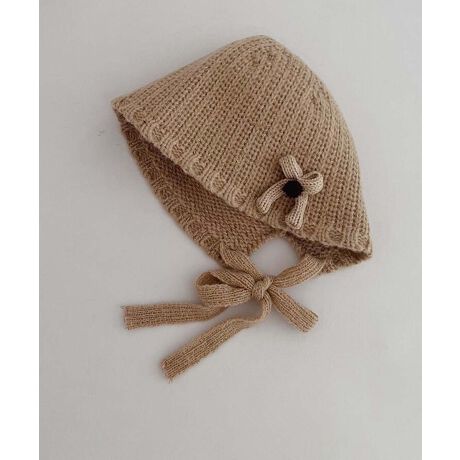 柔らかなニット素材を使用しており、側面に小さなリボンモチーフが付いているニットキャップ。シンプルなデザインにかわいらしさをプラスして、あご紐が付いているため、帽子がしっかり固定され、風の強い日や活発に動くシーンでも安心。素朴で温かみのある編み目が特徴で、手編みのようなぬくもりを感じられるデザインとなっています。