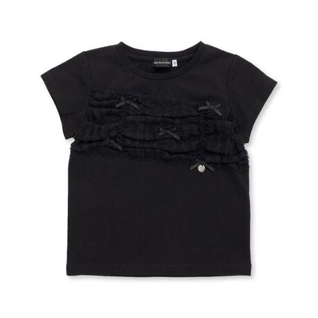 ビスチェのようにチュール生地を斜め合わせた切り替え半袖Tシャツ。
