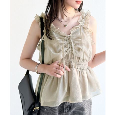 フリル・リボン・シャーリングと、ガーリーデティールが詰まったオーガンジービスチェ。