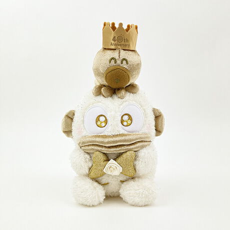 金ピカな40周年記念デザインのハンギョドンです。お友達と一緒に可愛い笑顔です。生地にもキラキラが入っておりよりキラキラして見えるデザインです。こちらはぬいぐるみSサイズです。