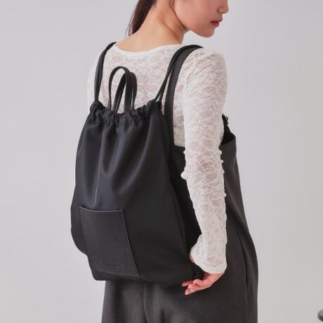 ドローストリングの紐部分と本体上部の持ち手、フロントポケット部分は合皮素材を使用して大人っぽくきれいめな印象に仕上げています。