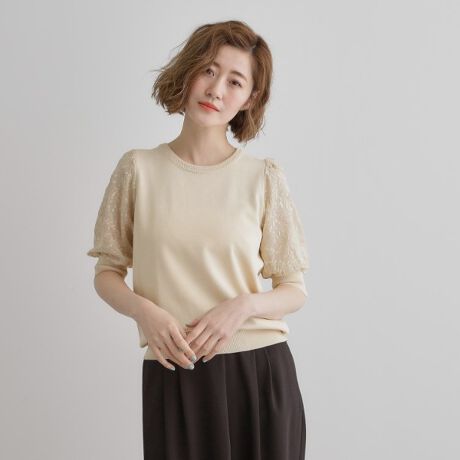 ほんのり透ける抜け感がポイント!袖コンシャスな刺繍ニットプルオーバー