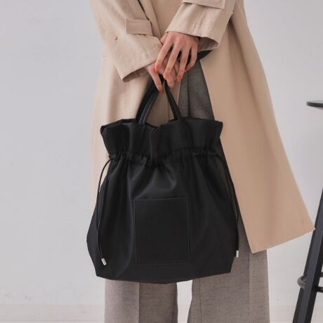 両側の紐を引いてドローストリングができる仕様で、きゅっと絞ると巾着のシルエットになるので、
