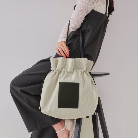ドローストリングの紐部分と持ち手、フロントポケット部分は合皮素材を使用して大人っぽい印象に仕上げています。