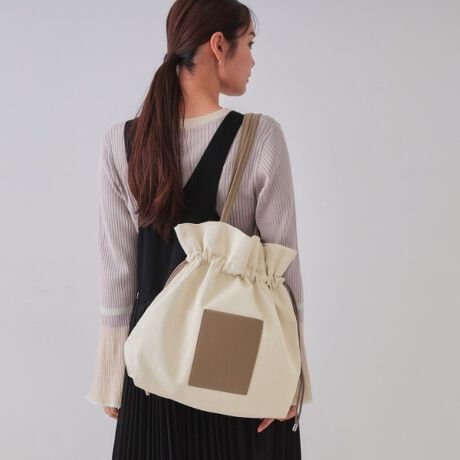 両側の紐を引いてドローストリングができる仕様で、きゅっと絞ると巾着のシルエットになるので、